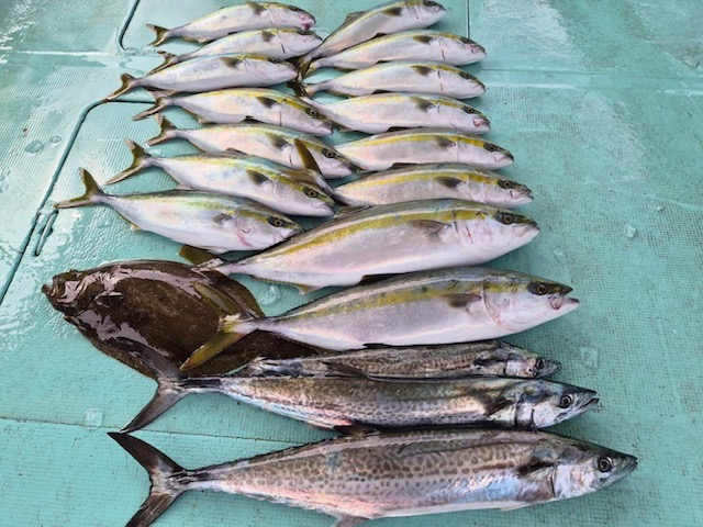 10月11日(土)の釣果・・メジロ2匹・ハマチツバス13匹・サワラ2匹・サゴシ1匹・ヒラメ1匹