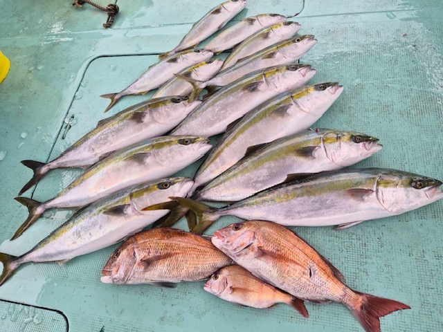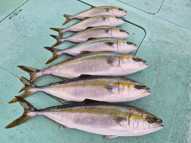 10月20日(月)の釣果・・メジロ10匹(バラシあり)・ハマチ10匹・ サワラ6匹(バラシあり)・サゴシ1匹・タイ3匹・サバ6匹 ※申し訳ございませんm(_ _)m個人写真撮れませんでしたm(_ _)m