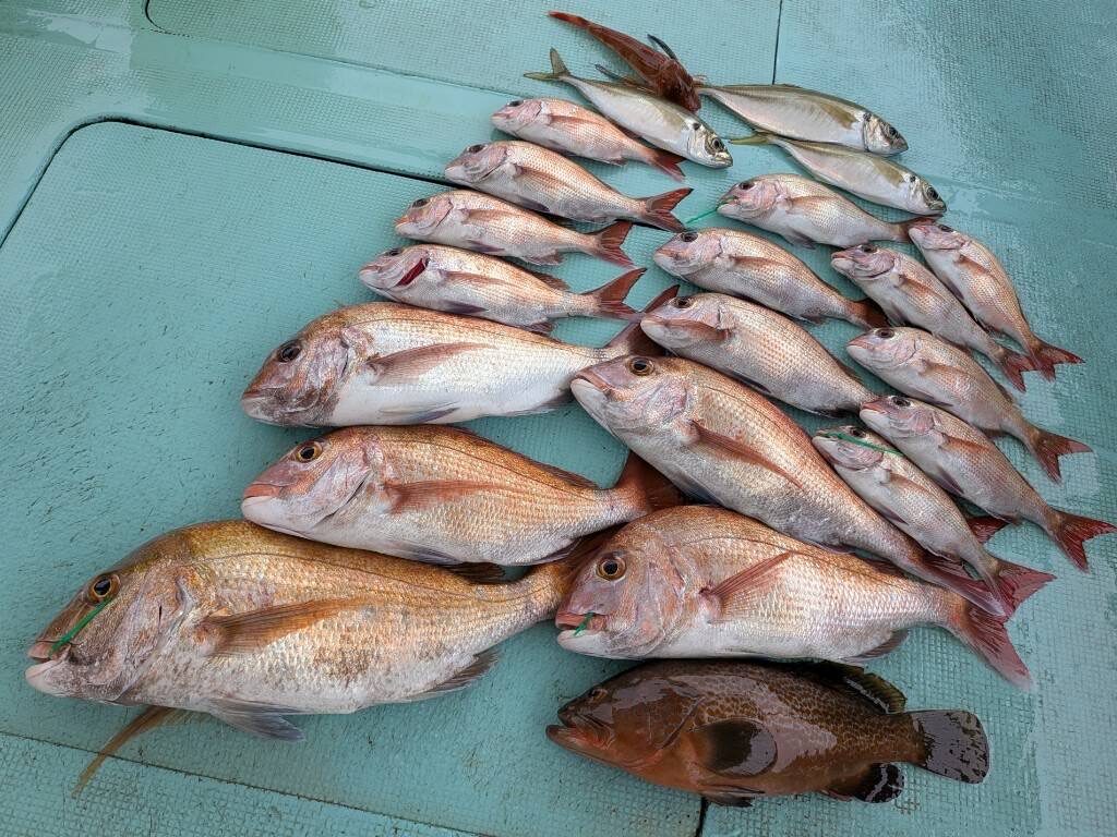 12月21日(日)の釣果・・タイ19匹(写真他リリース2匹)・アコウ1匹・アジ4匹(写真他1匹クーラー)・ホウボウ1匹