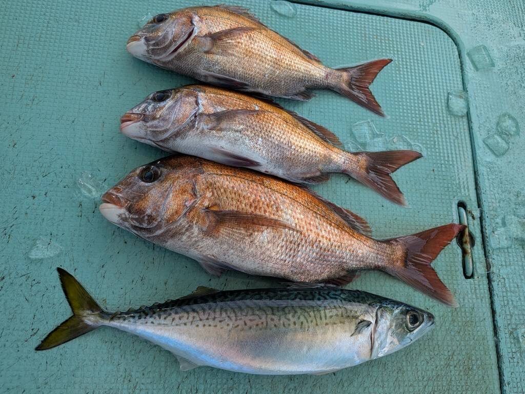 4月12日(日)の釣果・・タイ3匹(36〜45㌢)・サバ1匹(43㌢)