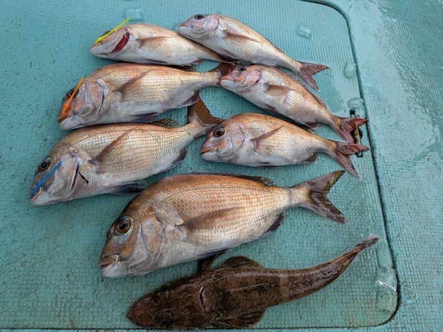 4月14日(火)10名様の釣果・・タイ7匹(42〜29㌢)・コチ1匹・ガシラ バラシもありました(>_<)、
